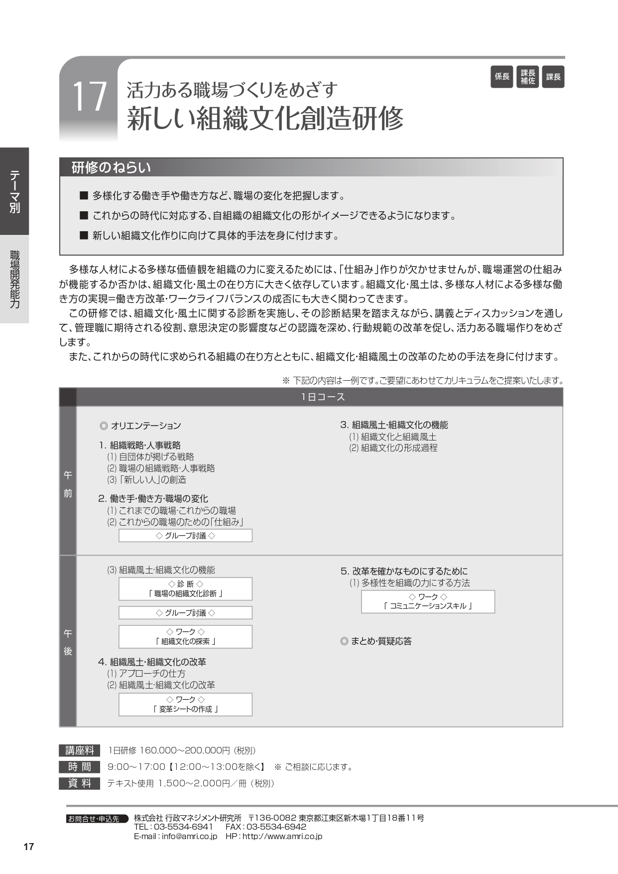 この研修では、組織文化・風土に関する診断を実施し、その診断結果を踏まえながら、講義とディスカッションを通して、管理職に期待される役割、意思決定の影響度などの認識を深め、行動規範の改革を促し、活力ある職場作りをめざします。