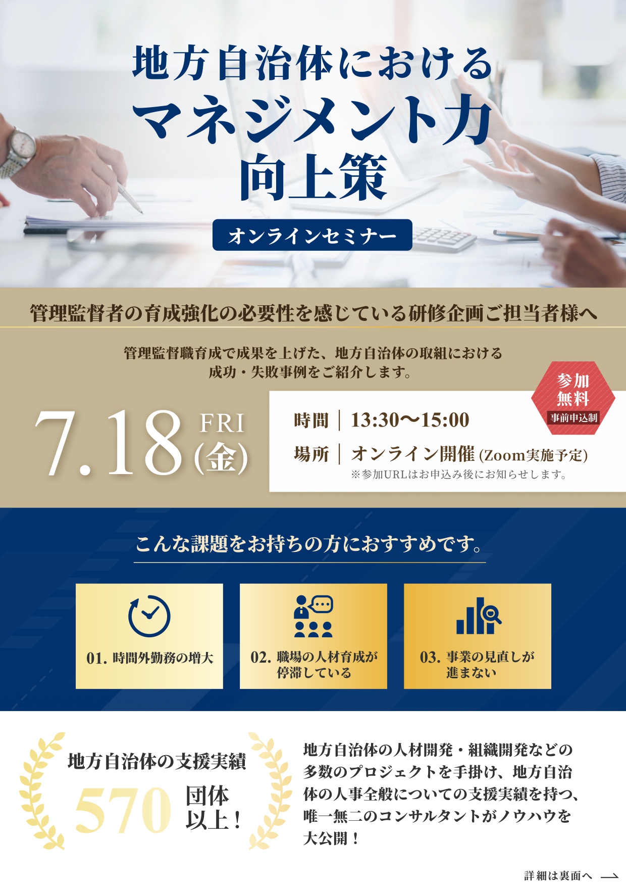 • 【※開催終了しました】7月18日開催 オンラインセミナー「地方自治体におけるマネジメント力向上策」のご案内